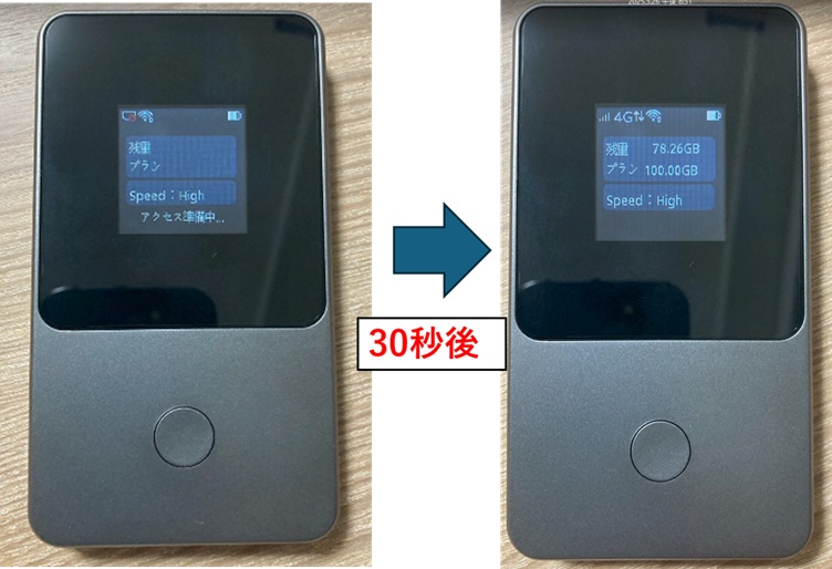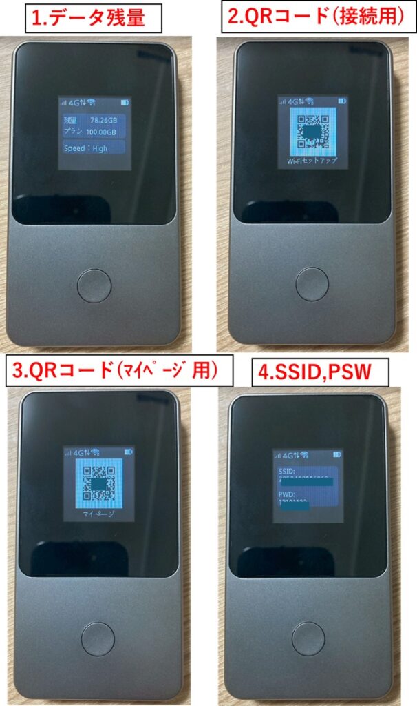 (1.データ残量→2.QRコード(接続用)→3.QRコード(マイページ用)→4.SSID/PSW)