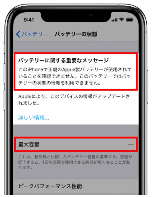 純正品のバッテリーではないですよとiPhoneが警告してくれています。